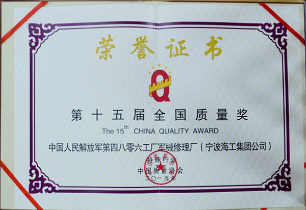 2015年,共有來自全國18個省、自治區(qū)、直轄市的70余家組織申報全國質(zhì)量獎,覆蓋國民經(jīng)濟26個行業(yè)大類,經(jīng)過嚴格的資格審查、資料評審、現(xiàn)場評審、工作委員會審議、網(wǎng)上公示、審定委員會審定等程序,評選出9家組織榮獲第十五屆全國質(zhì)量獎,工廠是今年唯一一家獲得“全國質(zhì)量獎”的軍隊企業(yè)化工廠,也是東海方向及寧波地區(qū)第一家獲此殊榮的企業(yè),樹立了“海工”新標(biāo)桿,提升了“海工”品牌形象。